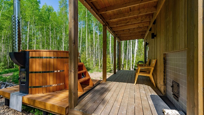 Особое внимание заслуживают две лесные бани. Их панорамные окна открывают захватывающий вид на окружающий лес прямо из парной. Каждая баня оборудована просторной купелью с подогревом от дровяной печи.