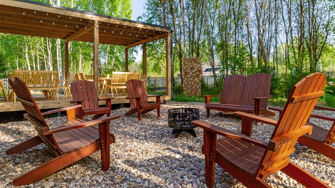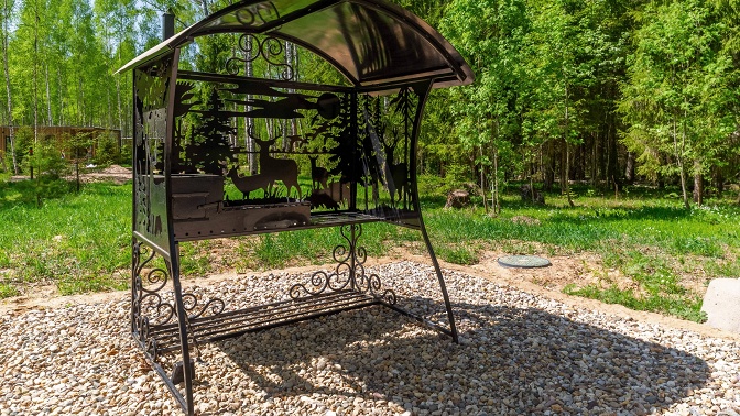 — большой мангал рядом с домом и уличная мебель, решетки, шампуры;