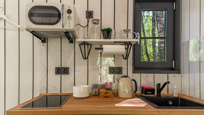 — полностью оснащенная кухня: плита, микроволновка, холодильник, чайник, наборы посуды, кастрюли, сковородки;